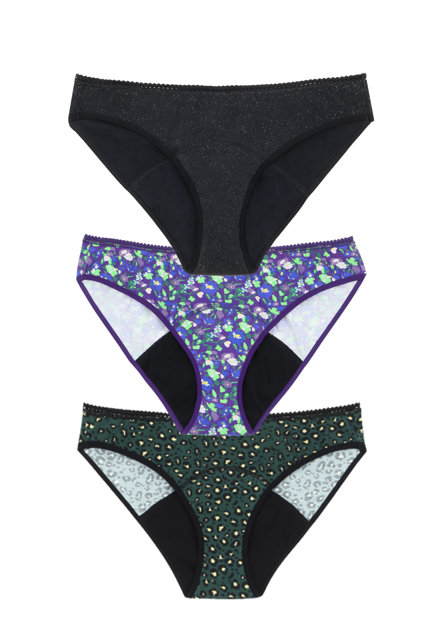 - 3 culottes pour flux abondant : Léopard Green, Paillettes et Rainbow Green
