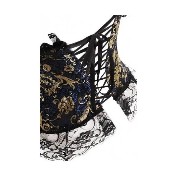 Un corset super chic, damassé bleu et or, orné de dentelle noire .