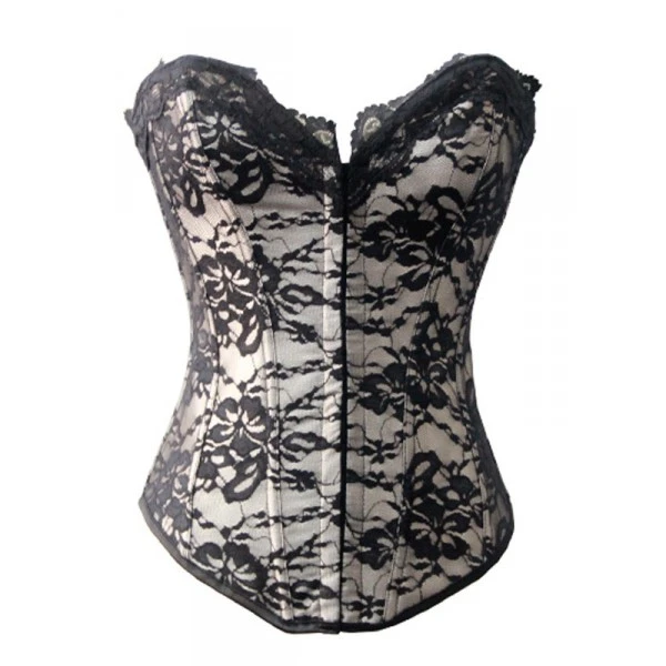 Un corset séduisant en dentelle noire sur fond couleur champagne. Laçage dans le dos avec un agraffage sur le devant pour plus de facilité. Livré avec le string assorti.