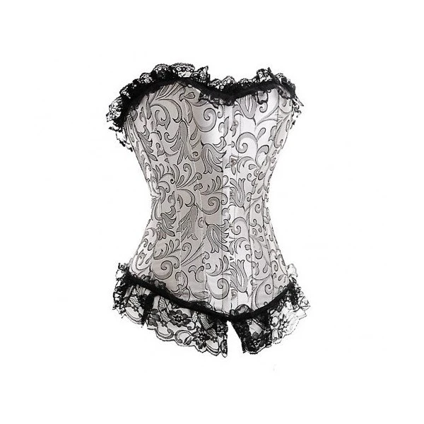 Magnifique corset damassé gris argent clair irisé satiné, surpiqué de délicats motifs noirs.
