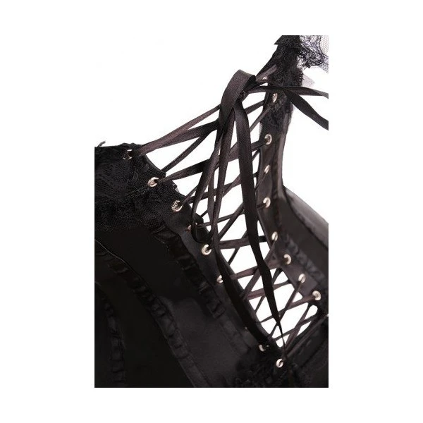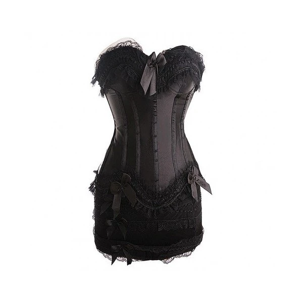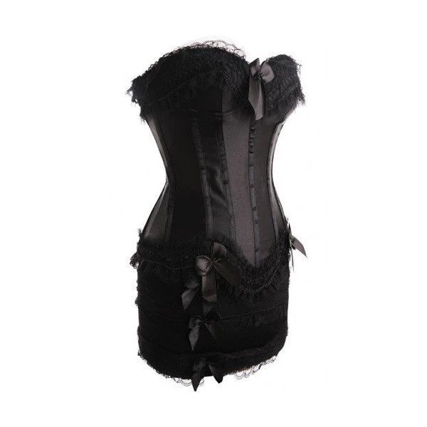 Un corset en satin noir, enrichi de rubans de satin noirs du plus bel effet accompagné d’une jupette assortie.