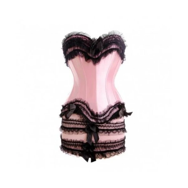 Un corset travaillé en satin rose, enrichi d’une dentelle noire du plus bel effet et une jupette assortie.