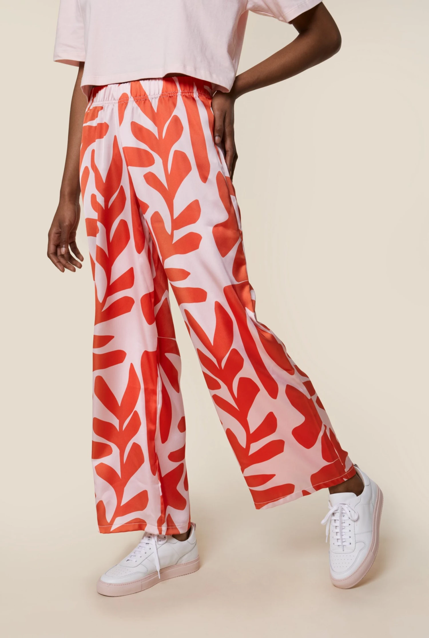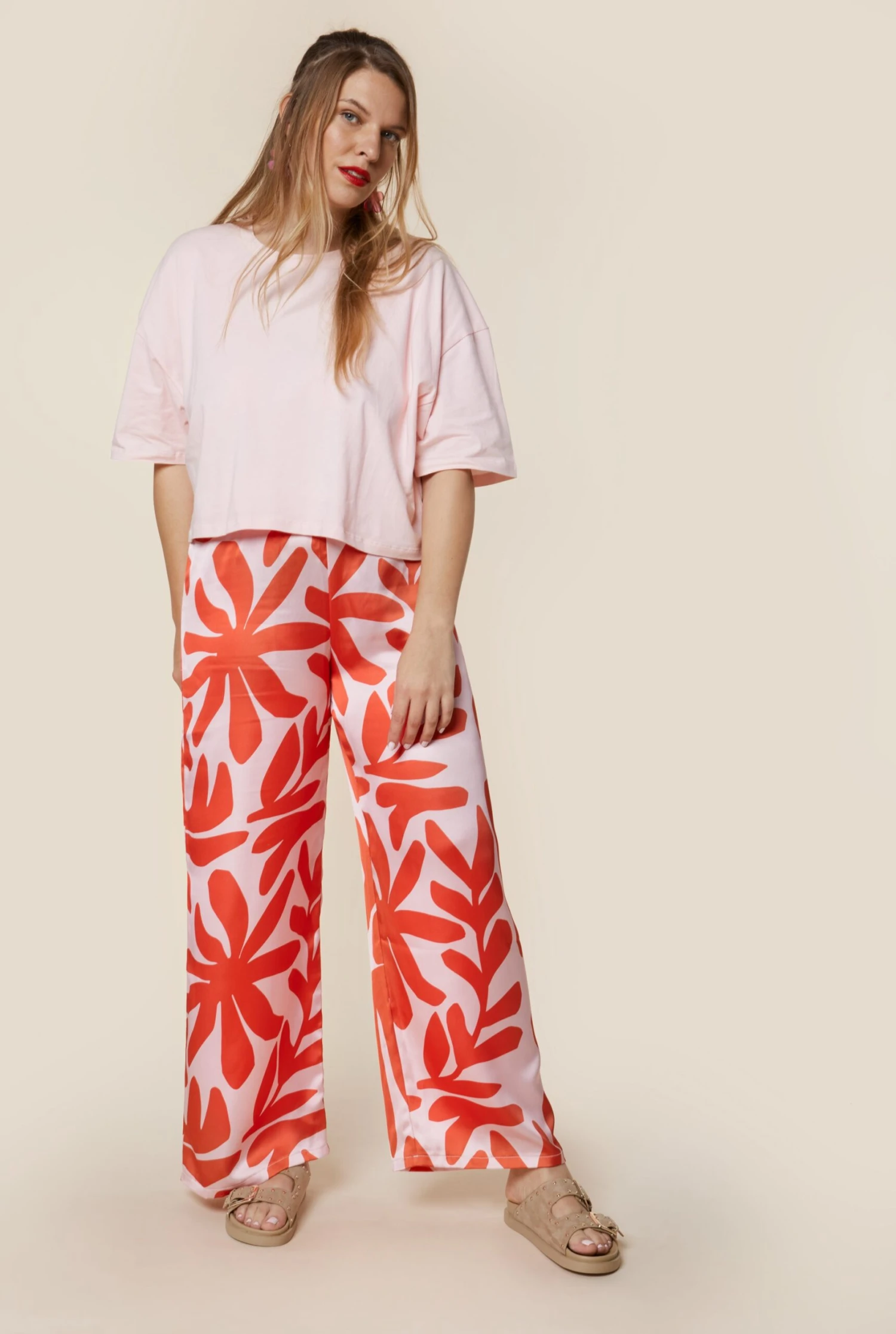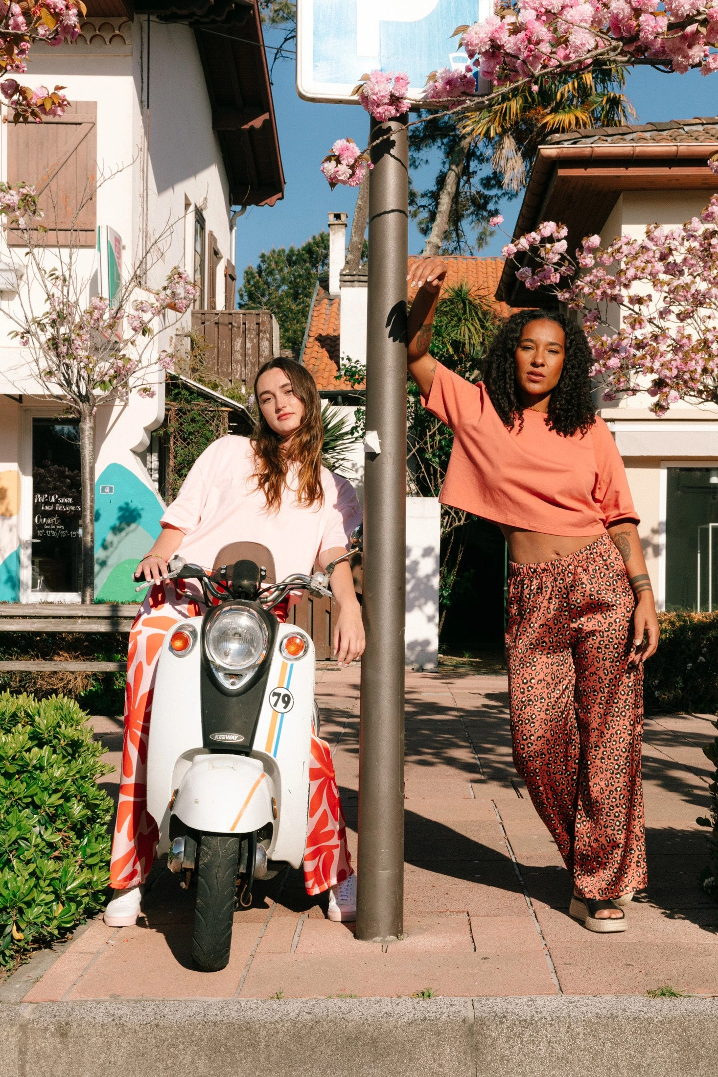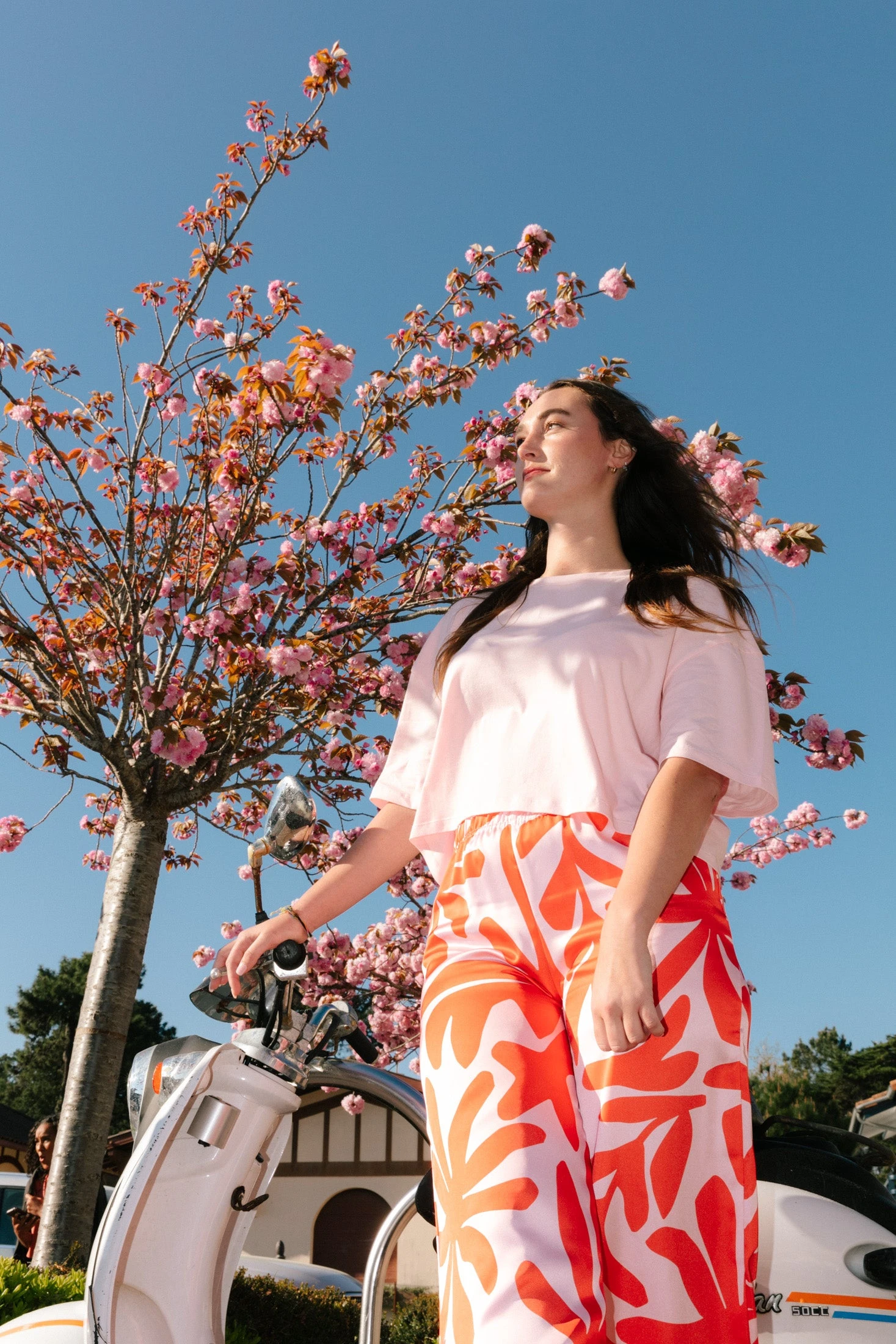 Pour le pantalon fluide, nous avons choisi le polyester recyclé, dont la texture est douce et soyeuse. On s’y sent à l’aise, tout en profitant de l’effet soie qui lui donne un côté élégant d’une manière désinvolte.