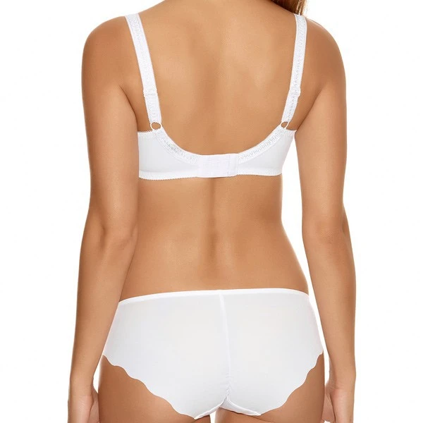 Alex est un modèle à la fois intemporel et discret mais qui saura mettre en valeur votre poitrine. Ce soutien-gorge est monté comme une corbeille mais reste emboîtant. Le bonnet en 3 parties avec couture verticale modèle la corbeille et la bande de renfort latérale vient ramener votre poitrine au centre de votre silhouette. Ainsi vous avez l’avantage de la corbeille et du maintien le tout rehaussé par une broderie suisse à motifs géométriques. Les slips et shorty coordonnés sont sans coutures et découpés au laser pour une parfaites invisibilité.