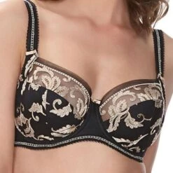Le soutien-gorge Sofia de la marque Fantasie ne laisse pas indifférent. Sa fine broderie suisse de ton or sur noir lui confère un look luxueux et d’inspiration somptueusement baroque. Les bonnets en 3 parties sont doublés et présentent sur le haut un empiècement transparent très raffiné. Aussi splendide soit-il ce soutien-gorge avec renfort latéral et armature grande taille n’en demeure pas moins très confortable. En effet, il est doté de renforts latéraux qui assurent un excellent soutien et rehaussent les poitrines opulentes. Conçu avec des bretelles larges et doublées pour soulager les épaules et une fermeture 3 crochets pour le bonnet H, il est aussi orné d’une jolie pierre précieuse à l’entre-seins. A compléter avec la culotte Fantasie Sofia noire assortie