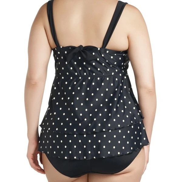 L’avis de Rondement Jolie : Voici un tankini qui sort de l’ordinaire, ses volants à ondulations apportent un style un peu plus destructuré que pour les coupes classiques, ils sont cousus latéralement pour limiter le flottement dans l’eau ! Le dessin à pois reste une valeur sûre et indémodable. On aime notamment la lègère bande de tissu au niveau de l’entre-seins qui met en valeur le volume des bonnets et le dos nu qui se dévoile à l’arrière…Enfin, et au vu de la qualité de confection des produits grande taille Elomi vous le garderez longtemps…